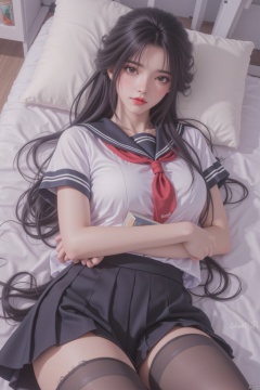 1girl, solo, long hair, looking at viewer, skirt, shirt, black hair, thighhighs, holding, brown eyes, school uniform, white shirt, short sleeves, pleated skirt, lying, serafuku, black thighhighs, indoors, on back, black skirt, sailor collar, black eyes, lips, neckerchief, pillow, book, holding book