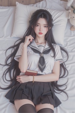 1girl, solo, long hair, looking at viewer, skirt, shirt, black hair, thighhighs, holding, brown eyes, school uniform, white shirt, short sleeves, pleated skirt, lying, serafuku, black thighhighs, indoors, on back, black skirt, sailor collar, black eyes, lips, neckerchief, pillow, book, holding book