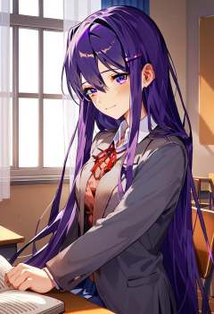 score_9, score_8_up, score_7_up, source_anime, YURI (DOKI DOKI LITERATURE CLUB), 1girl, solo, long hair, looking at viewer, blush, smile, bangs, hair ornament, long sleeves, ribbon, hair between eyes, sitting, very long hair, school uniform, purple eyes, jacket, purple hair, hairclip, indoors, from side, red ribbon, book, window, neck ribbon, chair, curtains, desk, open book, grey jacket, classroom, school desk, school chair, yuri \(doki doki literature club\)