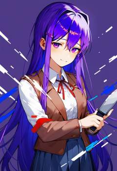 score_9, score_8_up, score_7_up, source_anime, YURI (DOKI DOKI LITERATURE CLUB), YURI SCHOOL UNIFROM, 1girl, solo, long hair, looking at viewer, blush, smile, bangs, skirt, simple background, shirt, hair ornament, long sleeves, ribbon, holding, hair between eyes, very long hair, school uniform, purple eyes, jacket, white shirt, purple hair, cowboy shot, pleated skirt, hairclip, collared shirt, red ribbon, blue skirt, neck ribbon, knife, wing collar, holding knife, glitch, yuri \(doki doki literature club\)