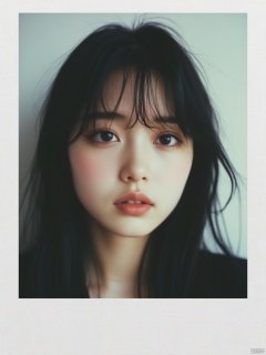 OBbllai, Polaroid photo, A close-up portrait of a young Asian girl with dark brown hair and dark brown eyes. Her eyes are a piercing blue and her eyebrows are a darker shade of brown. Her lips are a lighter shade of pink. Her hair is long and cascades over her shoulders. The backdrop is a stark white wall that is slightly blurred, creating a stark contrast to the girl's face.