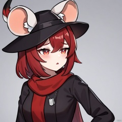 1girl,ratkin,show ears, solo,upper body,mouse girl,white mouse ears,mouse ear fluff,,, solo,red hair, black hat, hat feather, red scarf, black jacket, dog_tags,