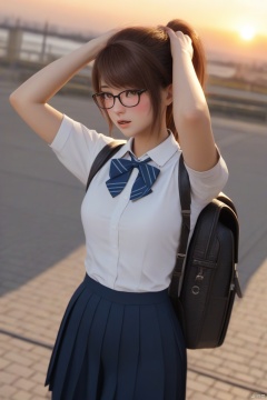 score_9,score_8_up,score_7_up,score_6_up,source_anime BREAK solo,best quality,highly detailed,ultra-high resolution,32K UHD,sharp focus,best-quality,masterpiece,Emotionalization,golden hour,unconventional supreme masterpiece,masterful details,temperate atmosphere,with a high-end texture,in the style of fashion photography,dynamic angle,dynamic posture, 1girl,solo,skirt,bag,brown hair,shirt,ponytail,school uniform,short sleeves,brown eyes,blue skirt,bow,white shirt,bowtie,long hair,pleated skirt,outdoors,bangs,backpack,blue bow,sunset,collared shirt,blush,sidelocks,parted lips,blue bowtie,cowboy shot,school bag,arm up,backlighting,glasses,