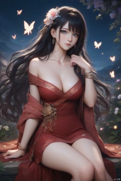 score_9,score_8_up,score_7_up, source anime,masterpiece,best quality,ultra detailed eyes BREAK 1girl,solo,flower,hair ornament,blue eyes,jewelry,breasts,sitting,long hair,butterfly,earrings,hair flower,looking at viewer,cleavage,dress,bracelet,medium breasts,red flower,collarbone,bare shoulders,bangs,black hair,hand up,closed mouth,off shoulder,skirt,gem,floating hair,red skirt,shawl,red dress,glint,feet out of frame,night,outdoors,