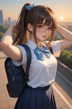 score_9,score_8_up,score_7_up,score_6_up,source_anime BREAK solo,best quality,highly detailed,ultra-high resolution,32K UHD,sharp focus,best-quality,masterpiece,Emotionalization,golden hour,unconventional supreme masterpiece,masterful details,temperate atmosphere,with a high-end texture,in the style of fashion photography,dynamic angle,dynamic posture, 1girl,solo,skirt,bag,brown hair,shirt,ponytail,school uniform,short sleeves,brown eyes,blue skirt,bow,white shirt,bowtie,long hair,pleated skirt,outdoors,bangs,backpack,blue bow,sunset,collared shirt,blush,sidelocks,parted lips,blue bowtie,cowboy shot,school bag,arm up,backlighting,glasses,