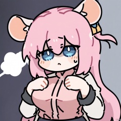 1girl,ratkin,show ears, solo,upper body,mouse girl,white mouse ears,mouse ear fluff,,,gotoh hitori,bocchi the rock!,pink hair,blue eyes,long hair,bangs,hair between eyes,cube hair ornament,hair ornament,one side up,breasts
