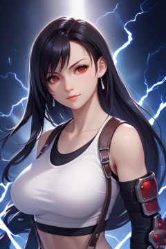 score_9,score_8_up,score_7_up,score_6_up,best quality,highly detailed,ultra-high resolution,32K UHD,sharp focus,best-quality,masterpiece,Emotionalization,golden hour,unconventional supreme masterpiece,masterful details,temperate atmosphere,with a high-end texture,in the style of fashion photography,dynamic angle,dynamic posture, 1girl,tifa lockhart,solo,gloves,long hair,fingerless gloves,jewelry,red eyes,black hair,crop top,elbow gloves,suspenders,earrings,bare shoulders,breasts,looking at viewer,upper body,large breasts,shirt,elbow pads,electricity,