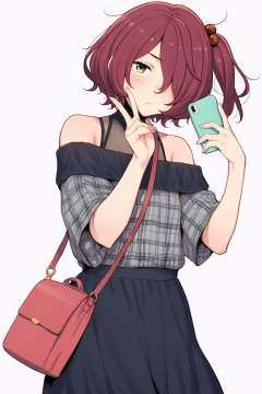 <lora:make_heroine_ga_oo_sugiru_style_ill-xl-v0.1-000013:1>,masterpiece,best quality,1girl, komari_chika, solo, shirt, skirt, bag, holding, white_background, simple_background, looking_at_viewer, phone, v, plaid, hair_ornament, black_skirt, cellphone, hair_bobbles, blush, holding_phone, shoulder_bag, smartphone, handbag, off_shoulder, hair_over_one_eye, bare_shoulders, plaid_shirt, closed_mouth, short_sleeves, black_shirt