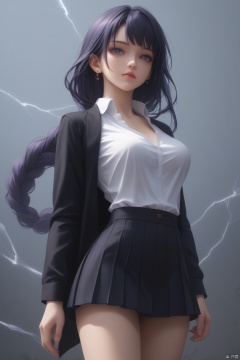 score_9,score_8_up,score_7_up,score_6_up,(masterpiece, best quality:1.2), raiden shogun_(genshin_impact),raiden shogun (genshin impact), 1girl,slim body,slim legs,large breasts,arm_tattoo,blue,cowboy_shot,earrings,energy,floating,foreshortening,glowing,holding lightning,lightning,jaguar_print,jewelry,female_focus,open_clothes,student uniform,pleated_skirt, white aura around body,aura,ultra-instinct, A shot with tension,(Visual impact,giving the poster a dynamic and visually striking appearance:1.2),impactful picture, offcial art,colorful,splash of color,movie perspective,advertising style,magazine cover,