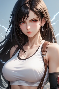 score_9,score_8_up,score_7_up,score_6_up,best quality,highly detailed,ultra-high resolution,32K UHD,sharp focus,best-quality,masterpiece,Emotionalization,golden hour,unconventional supreme masterpiece,masterful details,temperate atmosphere,with a high-end texture,in the style of fashion photography,dynamic angle,dynamic posture, 1girl,tifa lockhart,solo,gloves,long hair,fingerless gloves,jewelry,red eyes,black hair,crop top,elbow gloves,suspenders,earrings,bare shoulders,breasts,looking at viewer,upper body,large breasts,shirt,elbow pads,electricity,