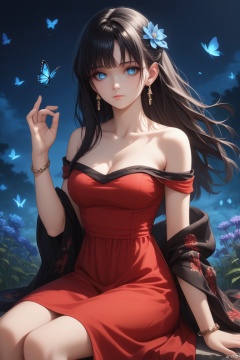 score_9,score_8_up,score_7_up, source anime,masterpiece,best quality,ultra detailed eyes,BREAK,1girl,solo,flower,hair ornament,blue eyes,jewelry,breasts,sitting,long hair,butterfly,earrings,hair flower,looking at viewer,cleavage,dress,bracelet,medium breasts,red flower,collarbone,bare shoulders,bangs,black hair,hand up,closed mouth,off shoulder,skirt,gem,floating hair,red skirt,shawl,red dress,glint,feet out of frame,night,outdoors,