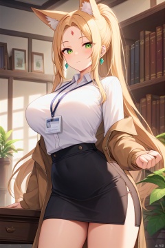 score_9,score_8_up,score_7_up,score_6_up,source_anime,1girl, solo, long hair, breasts, looking at viewer, bangs, skirt, large breasts, shirt, long sleeves, animal ears, jewelry, very long hair, closed mouth, green eyes, standing, jacket, ponytail, white hair, thighs, cowboy shot, earrings, indoors, black skirt, animal ear fluff, parted bangs, book, fox ears, facial mark, plant, desk, side slit, high-waist skirt, forehead mark, bookshelf, potted plant, id card