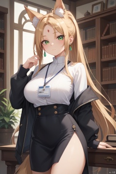 score_9,score_8_up,score_7_up,score_6_up,source_anime,1girl, solo, long hair, breasts, looking at viewer, bangs, skirt, large breasts, shirt, long sleeves, animal ears, jewelry, very long hair, closed mouth, green eyes, standing, jacket, ponytail, white hair, thighs, cowboy shot, earrings, indoors, black skirt, animal ear fluff, parted bangs, book, fox ears, facial mark, plant, desk, side slit, high-waist skirt, forehead mark, bookshelf, potted plant, id card