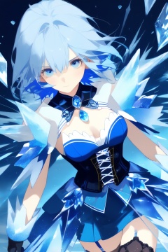 masterpiece,best quality, 1girl, blue hair, ice hair, blue eyes, ice shards, hands crystal ice, ice blade, blue magic circle, blue corset, black thighhighs, sidelighting, light particles, abstract,