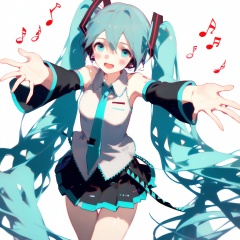 masterpiece,best quality,1girl,hatsune miku,twintails,necktie,solo,skirt,shirt,aqua hair,black skirt,aqua eyes,detached sleeves,long hair,sleeveless,white shirt,open mouth,white background,aqua necktie,black sleeves,sleeveless shirt,outstretched arms,very long hair,blush stickers,pleated skirt,hair ornament,miniskirt,bare shoulders,musical note,
