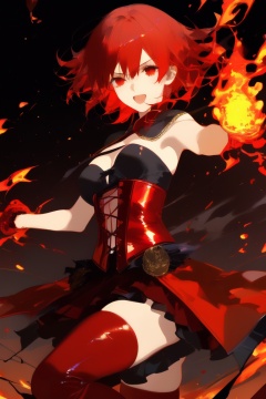 masterpiece,best quality,1girl,red hair,flaming hair,red eyes,flames,hands in flame,flame blade,red magic circle,red corset,black thighhighs,sidelighting,light particles,abstract,