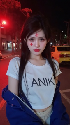 Captured at eye-level a close-up shot captures a young Asian woman with long dark hair wearing a white t-shirt with the word "ANIK" written on the front in black letters. She is wearing a blue jacket with a white stripe down the left side of the jacket. The woman's face is covered in red paint adding a pop of color to her outfit. The backdrop is a city street at night with a yellow car parked on the right side. The street is illuminated by a red light creating a vibrant contrast to the woman's outfit.,
