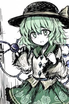 ,simple background,komeiji koishi,1girl, hat,hat bow,green hair,green eyes,yellow shirt,green skirt,,long sleeves, wide sleeves, floral print,third eye,eyeball,cute,white background,greyscale,black and white line drawing,lineart