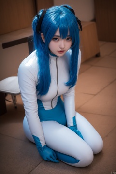 1girl, solo, long hair, breasts, looking at viewer, bangs, blue eyes, gloves, medium breasts, sitting, blue hair, full body, indoors, lips, cosplay, bodysuit, alternate hairstyle, wariza, reflection, realistic, nose, on floor, pilot suit, plugsuit, white bodysuit, interface headset, hairpods, reflective floor, souryuu asuka langley, ayanami rei