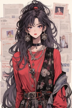 1girl, solo, long hair, looking at viewer, shirt, black hair, jewelry, upper body, earrings, choker, necklace, black eyes, vest, grey eyes, makeup, black choker, piercing, red shirt, ear piercing, red lips