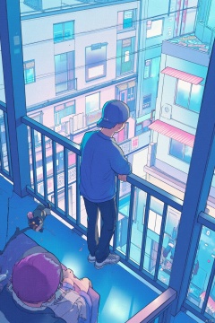 1girl, solo, shirt, long sleeves, 1boy, hat, standing, pink hair, male focus, shoes, pants, window, shadow, umbrella, from above, cat, building, baseball cap, city, railing