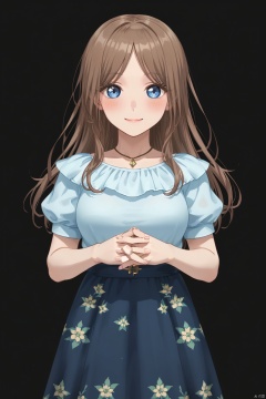 1girl, solo, long hair, breasts, looking at viewer, blush, smile, blue eyes, skirt, simple background, brown hair, shirt, jewelry, short sleeves, puffy sleeves, necklace, floral print, own hands together, blue shirt, black background, long skirt,Nagasaki Soyo,bangs