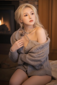 Generate hyper realistic image of a blonde woman resembling a Barbie doll, sitting on a brown couch. She has long, straight blonde hair and striking blue eyes, looking directly at the viewer with a warm smile. The woman wears a cozy gray knitted sweater and a matching gray knitted skirt, accessorized with a silver necklace and earrings. Her left hand gracefully rests on her right shoulder, accentuating her hourglass figure with a full bust, narrow waist, and wide hips. In the upper right corner, a fireplace casts a warm glow, illuminating the inviting scene.