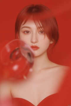 (masterpiece, high quality, fisheye:1.2),(close-up portrait:1.1), solo, model photoshoot,(red theme:1.1), a stylish girl,red hair,silver eyes,red lipstick,red eye shadow,blush,(freckles:0.7), (Chinesewomen, 22 years old:1.3),sexy, pure innocence,(light smile:0.8), in love, simple red dress, cleavage, detailed natural skin texture, seductive gaze, detailed lighting, (red:1.1) wall background, shallow depth of field, romantic setting, dreamy pastel palette, whimsical details, captured on film, (intricate details:0.5),