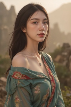 A serene, sepia-toned masterpiece photography captures a young woman, embodying the essence of a 19th-century leng plateau pilgrim, amidst a misty, golden-hued backdrop. She stands with her back to a rugged, rocky mountain range, her slender figure draped in a flowing, intricately embroidered turquoise and crimson robe. Her dark brown, shoulder-length hair cascades down her back, with a few loose strands framing her heart-shaped face. Her smooth, honey-toned skin glows softly, and her full lips curve into a gentle, enigmatic smile. Her large, almond-shaped brown eyes, fringed with thick lashes, seem to hold a deep, inner wisdom. A delicate, antique silver necklace adorns her neck, featuring a small, polished turquoise stone. The soft, diffused light of a warm, sunlit day casts a golden glow on her face, while the misty atmosphere surrounding her creates an ethereal, dreamlike quality. The image is shot in a 4:3 aspect ratio, with a shallow depth of field, emphasizing the subject's face and torso. The color grading is reminiscent of Terrence Malick's lyrical, naturalistic style, with a slight, film-like grain and a warm, nostalgic tone.