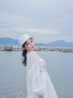 A woman is standing on the riverbank. She is wearing a white long sleeved dress and a white hat. Her hair draped over her shoulders, adding a touch of dynamism to her face. The sky is a soft blue with a few thin clouds that add depth to the scene. The woman's gaze turned towards the audience. The background is a peaceful lake, with rocks and mountains in the distance.