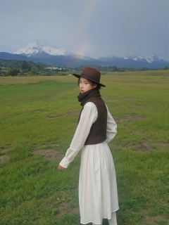 After the rain cleared up, a woman wearing a white dress, brown vest, and brown hat stood at eye level. She looked up at a mountain range with a rainbow in the distance. The woman's hair is dark brown and she is wearing a brown scarf. She stood on a green grassland with patches of soil on it. In the distance, the mountains are covered in snow, and the sky is deep blue.