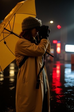 Astrid Wilder, a captivating young photographer, stands amidst a rain-soaked cityscape, her eyes fixed on the lens of her camera as she captures the vibrant streetlights reflecting off the wet pavement. Raindrops glisten on the brim of her hat and the shoulders of her trench coat, while the dark urban backdrop provides a striking contrast to her bright yellow umbrella.,black,biological