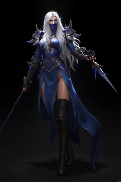 A stunning warrior maiden stands tall, her long white hair flowing down her back. She wears a blue armored dress with gold trim, adorned with shoulder armor and gauntlets. Her thighs are encased in thigh-highs, and she dons black boots with armor plating. A mask covers her face, adding to her enigmatic aura. In one hand, she holds a staff, while the other grasps a weapon at her side. The dark background highlights her imposing figure, ready for battle.