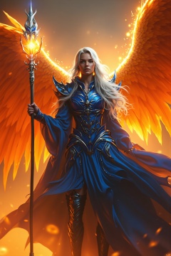 A majestic sorceress clad in shimmering blue armor stands amidst a fiery glow. Her long white hair flows like silk in the flames' warmth. Her wings, ablaze with fiery feathers, stretch out to either side as she holds her staff aloft, channeling mystical energy. The camera frames her in a golden light, with dark shadows accentuating the dramatic pose.