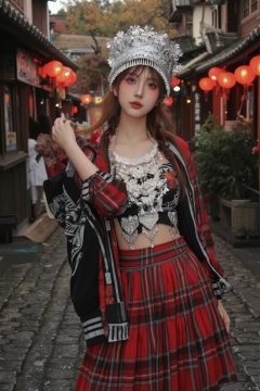 1girl, solo, looking at viewer, blush, bangs, skirt, brown hair, shirt, long sleeves, hat, holding, closed mouth, purple eyes, jacket, ponytail, cowboy shot, orange hair, plaid, red skirt, plaid skirt, baseball cap,miaofu,Silver headwear, jewelry, earrings, forehead mark,white hair,qfl,forehead mark,qfl,INS风-Flux 起风1.0