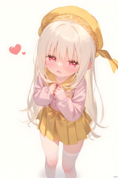 long hair, breasts, blush, open mouth, bangs, 1 girl, skirt, blonde hair, shirt, red eyes, long sleeves,  hat, hair between eyes, standing, white hair, heart, sweat, pleated skirt, small breasts, no shoes,  socks,  symbol-shaped pupils, kneehighs, loli, saliva,trembling,  pink shirt,yellow skirt, yellow headwear, illyasviel von einzbern