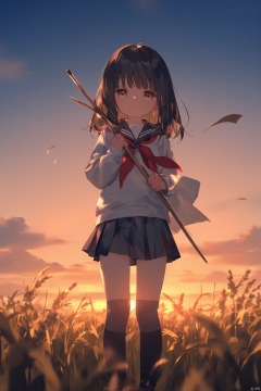 1girl, black_hair, black_legwear, brown_eyes, cloud, cloudy_sky, dusk, evening, gradient_sky, kneehighs, long_sleeves, neckerchief, orange_sky, outdoors, paper, pleated_skirt, red_neckerchief, red_sky, school_uniform, serafuku, shoes, skirt, sky, solo, sun, sunset, twilight, utility_pole