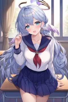 score_9,score_8_up,score_7_up,score_6_up,score_5_up,score_4_up,source_anime,source_cartoon,<lora:robinTUPONYXL-000008:1>,robin \(honkai: star rail\),1girl,solo,skirt,breasts,halo,school uniform,long hair,serafuku,sailor collar,looking at viewer,pleated skirt,smile,earrings,long sleeves,blue sailor collar,white shirt,open mouth,blue skirt,shirt,jewelry,neckerchief,desk,grey hair,hair bun,blush,red neckerchief,cross earrings,thighs,head wings,cross,indoors,cowboy shot,classroom,hair intakes,window,school desk,green eyes,head tilt,collarbone,hand up,