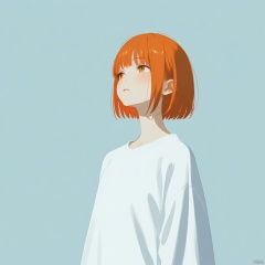 The image features a female subject with a striking and stylized appearance, standing against a soft, pale blue background. She has a distinct orange bob haircut and a contemplative or distant expression on her face, with her eyes gazing slightly upwards. She is wearing a plain white sweatshirt, which contrasts with her bright hair and pale skin. Notably, her skin is dotted with freckles, adding to the realism and texture of the image. The overall mood appears serene and somewhat introspective, emphasized by the minimalist styling and the soft lighting that casts gentle shadows on the subject's face.