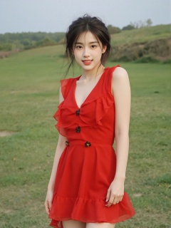 a young Asian woman stands in a vibrant red sleeveless dress adorned with black flowers. Her hair is pulled back, cascading over her shoulders, adding a touch of warmth to her face. The dress is adorned with a deep V-neckline, adorned with small black flowers adorns the dress. She is smiling, her lips pursed, and her eyes are slightly open. The backdrop, a grassy field stretches out to the left of her, with a hill covered in trees and bushes in the distance. The sky is a muted blue, dotted with a few wispy clouds.