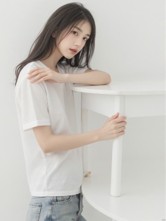 a young Asian woman with long dark brown hair, wearing a white short-sleeved t-shirt and jeans, is leaning on a white table. Her left hand is resting on the table, adding a touch of touch to the scene. The backdrop is a stark white wall, creating a stark contrast to the woman's white shirt.