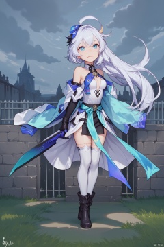 An animated image of a girl with long white hair and blue eyes. She is wearing a white and blue dress with a black belt around her waist. She has black boots on her feet and black gloves on her hands. Her hair is blowing in the wind and she is holding a sword in her right hand. The sword is a bright blue color. Behind her is a gray brick wall with green grass growing on it. Behind the wall is a white fence and behind the fence are buildings. The sky is filled with dark gray clouds.