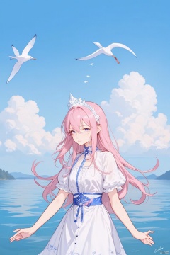A girl with long pink hair and a white crown on her head. She is standing in front of a body of water. The sky is blue with white fluffy clouds. There are white seagulls flying in the sky above the girl. The girl is wearing a white dress with blue accents. Her arms are out to her sides. Her hair is blowing in the wind.