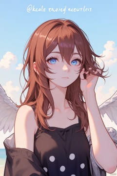 An animated animated image of a girl with long brown hair and blue eyes. She is wearing a black sleeveless shirt with white polka dots on it. Her left hand is holding her hair up to her ear. Her right hand is resting on her right hand. Her eyes are a bright blue color. Her hair is blowing in the wind. The background is a light blue sky with white clouds. There are white wings on either side of her.
