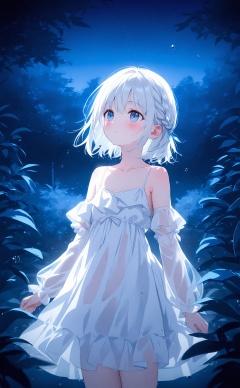 masterpiece,best quality,high quality,(colorful),loli,1girl, flower, dress, solo, white dress, short hair, blue eyes, white hair, braid, blue flower, night, tree, bare shoulders, collarbone, standing, frilled dress, detached sleeves, frills, closed mouth, spaghetti strap, outdoors, water drop, sky, long sleeves, wet, building, night sky, see-through, flat chest, looking up, blush, cowboy shot, plant, arms at sides, expressionless