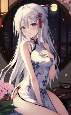 masterpiece,best quality,high quality,(colorful),loli,1girl, chinese clothes, china dress, dress, solo, hand on own chest, long hair, hair ornament, looking at viewer, sitting, white dress, white hair, between legs, sleeveless, pelvic curtain, breasts, hair stick, thighs, round window, sleeveless dress, parted lips, bare shoulders, hand between legs, cherry blossoms, bare arms, petals, very long hair, mole under eye, lantern, flower knot, red ribbon, lattice, night, window, mole, hair bun, tears, ribbon, hair between eyes, blush, water drop, side slit, print dress, blurry, medium breasts, hairpin, crying, floral print, single hair bun, crying with eyes open, depth of field, hand up, sidelocks, half updo, falling petals, flower, blurry foreground, paper lantern, grey eyes, plant, moon, indoors, black eyes, tassel, tassel hair ornament