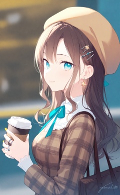 masterpiece,best quality,high quality,(colorful),loli,1girl,solo,jewelry,long hair,looking at viewer,shirt,brown hair,cup,hair ornament,holding,long sleeves,hat,earrings,ribbon,disposable cup,plaid headwear,blue eyes,aqua ribbon,yellow nails,beret,yellow headwear,white shirt,upper body,coffee cup,holding cup,blurry background,signature,dress,closed mouth,ring,neck ribbon,plaid dress,plaid,blurry,smile,hairclip,nail polish,from side,breasts,bag,star \(symbol\),brown dress,outdoors,brown headwear,medium breasts,aqua eyes,sidelocks,