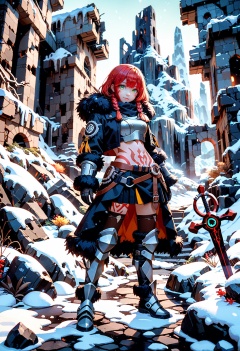 year 2023, onineko, tianliang duohe fangdongye, wlop, ciloranko, ask \(askzy\), miv4t, 1girl Tribal, barbarian, woman, barbarian-clothing, fur-trimmed jacket, brown leggings, thigh boots, long-sleeves, cropped jacket, chestplate, tsurime, ruins, Snow, ice, scenery, red-hair, long hair, braided sidelock, green-eyes, armored-boots, standing, body-markings