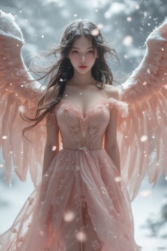 snow,luoxue,A winged goddess girl,a woman,(gray background),(8k, RAW photo, best quality, masterpiece:1.2),(realistic, photo-realistic:1.2)(raw photo) (extremely detailed CG unity 8k wallpaper) detailed and intricate,original,highres,(1girl)(solo)(looking at viewer)(pink dress)see-through,crop top,midriff,(large breasts)sex pose,(cowboy shot),(standing, from below,clothes in front:1.2) beautiful concept illustration,(cleavage_cutout),