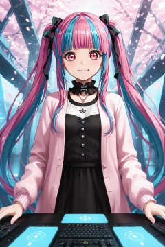 pareo, nyubara reona, 1girl, solo, long hair, smile, twintails, multicolored hair, two-tone hair, bangs, red eyes, blue hair, blunt bangs, very long hair, hair ribbon, pink eyes, streaked hair, pink hair, black hair, white hair<lora:peoro:0.8>